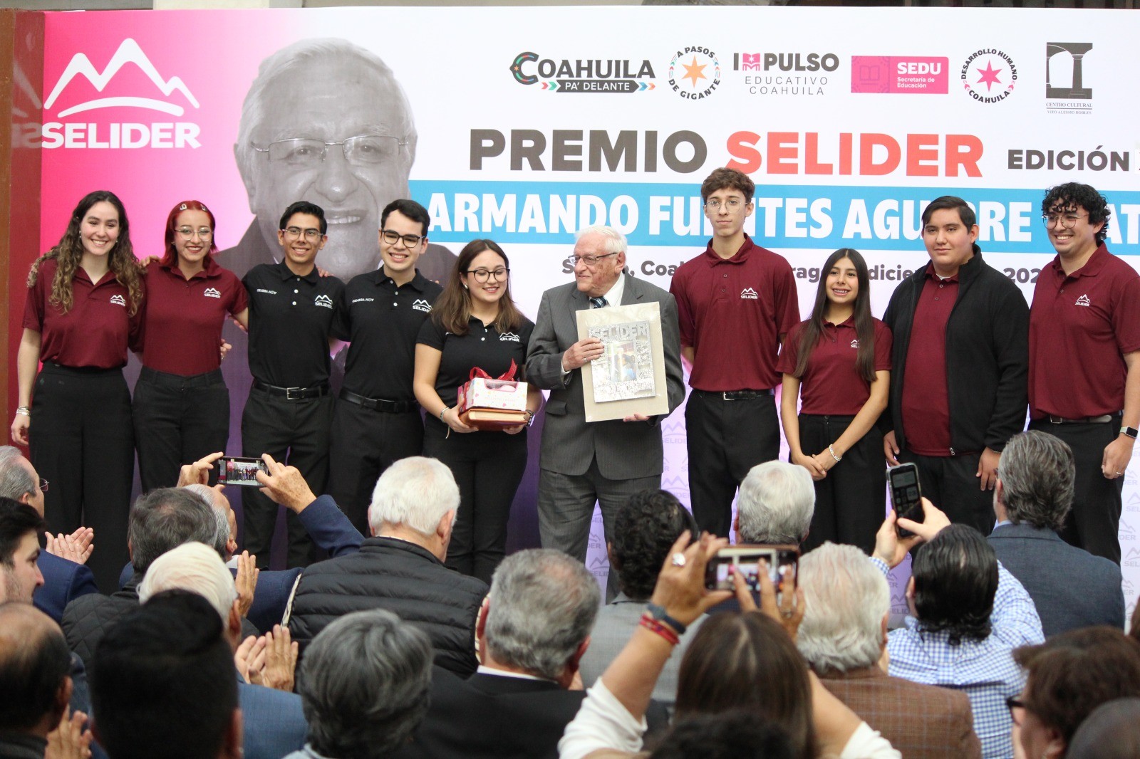 Saltillo, Coahuila de Zaragoza, a 10 de diciembre de 2024.- A nombre del gobernador Manolo Jiménez Salinas, el Secretario de Educación, Emanuel Garza Fishburn encabezó la entrega del Premio SeLíder 2024 al reconocido periodista, conferencista, historiador y catedrático saltillense Armando Fuentes Aguirre “Catón”.