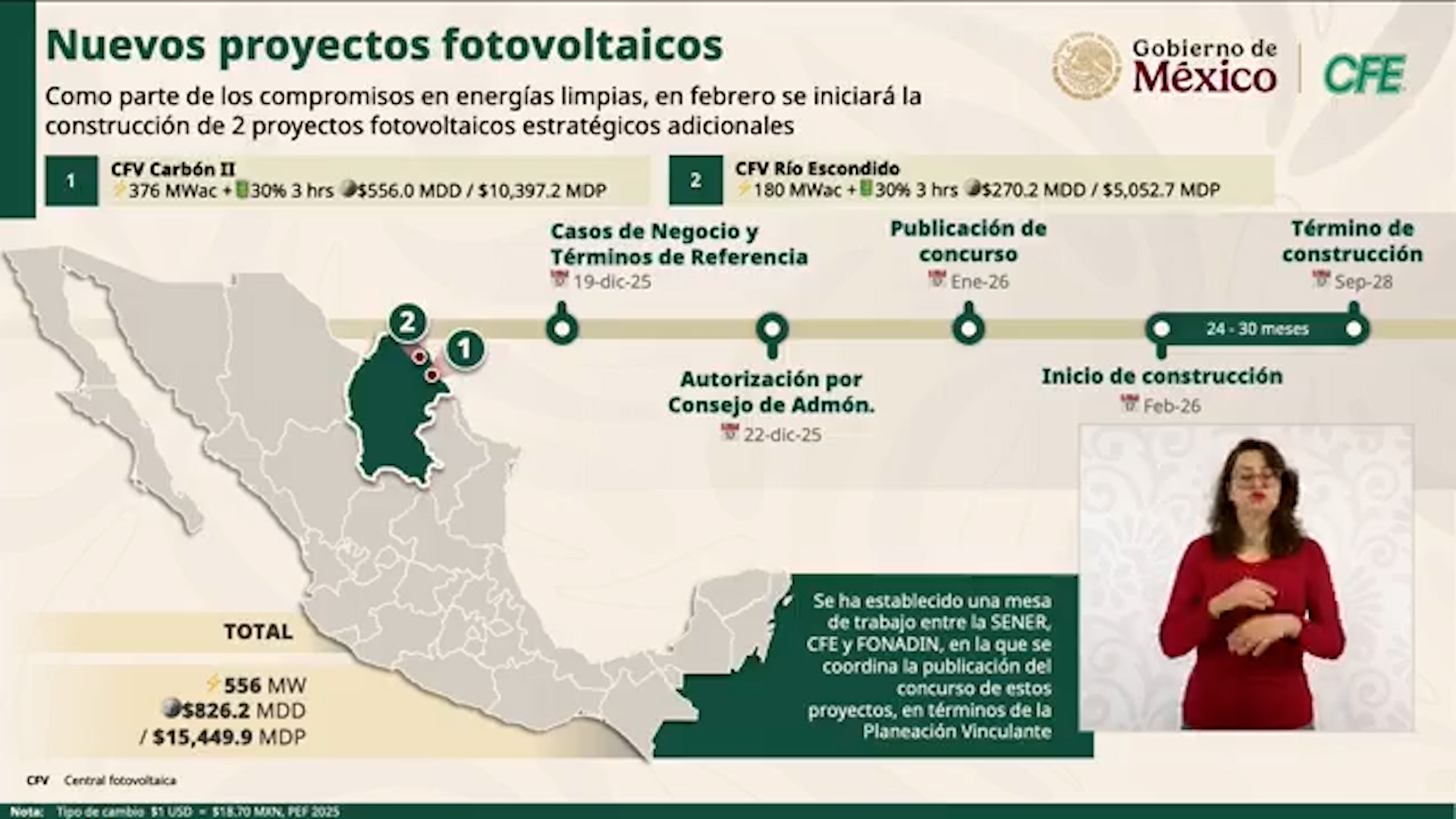 "Se trata de las centrales de Carbón II y la central fotovoltaica de Río Escondido, ubicados en el estado de Coahuila; que en conjunto van aportar 556 Megawhats de capacidad e incorporan sistemas de almacenamiento para un mejor aprovechamiento de la energía", indicó Emilia Calleja Alor, directora general de la CFE.