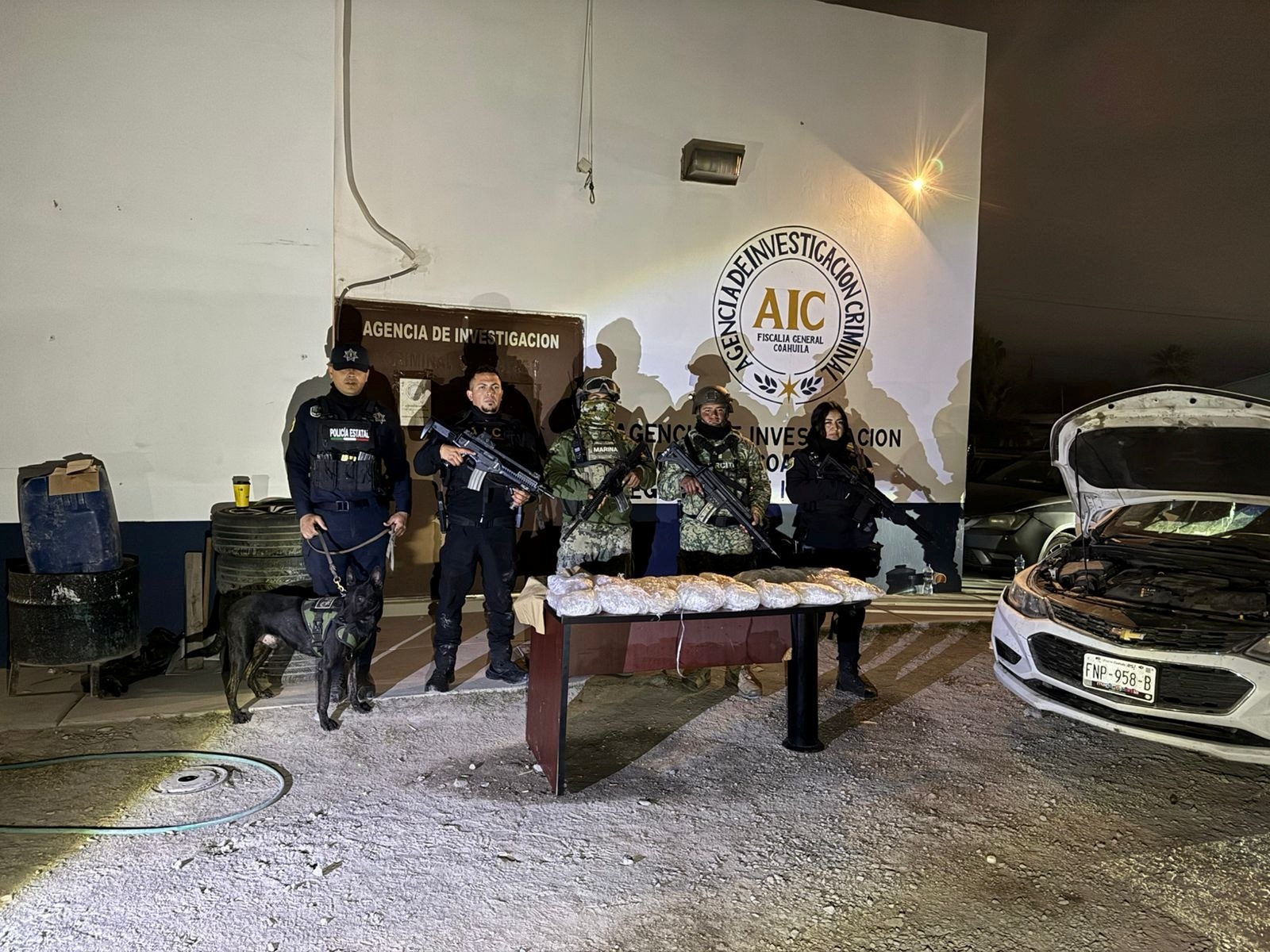 Nava, Coahuila; a 21 de enero de 2026.- Derivado de los recorridos de vigilancia que realizan de forma conjunta elementos de investigación de la Fiscalía General del Estado (FGE) en la región norte I y de la Secretaría de Seguridad Pública (SSP) del Estado de Coahuila, llevaron a cabo el aseguramiento de un automóvil presuntamente abandonado y un cargamento de 16 kilos de metanfetaminas, los cuales fueron localizadas en el interior de la unidad.