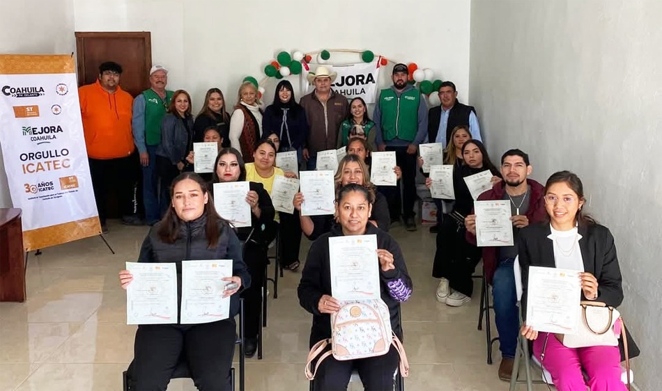 En la ceremonia de entrega de certificados, se contó con la presencia de la coordinadora regional de Mejora Coahuila Mari Carmen de León, en representación del coordinador general Gabriel Elizondo Pérez; Azeneth Torres, coordinadora de Acción Móvil del ICATEC, el coordinador municipal, Lucio Cavazos Espronceda, y los coordinadores locales del programa, Fernando Elizondo e Isaías Durán. (D.R. Síntesis Cinco Manantiales)