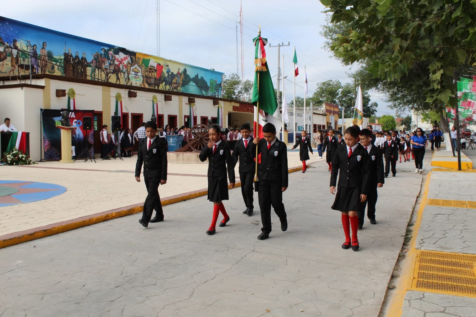 La ceremonia cívica estuvo a cargo de maestros y alumnos de la escuela primaria Cuauhtémoc del ejido Tío Pío.