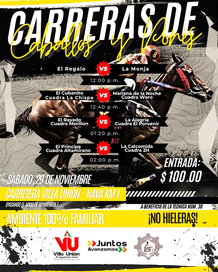 Villa Unión, Coahuila; a 27 de noviembre de 2025.- Este próximo sábado 29 de noviembre se llevarán a cabo las carreras de caballos y ponis, en apoyo a la escuela secundaria Técnica número 30 Antonio Perales Zamora.