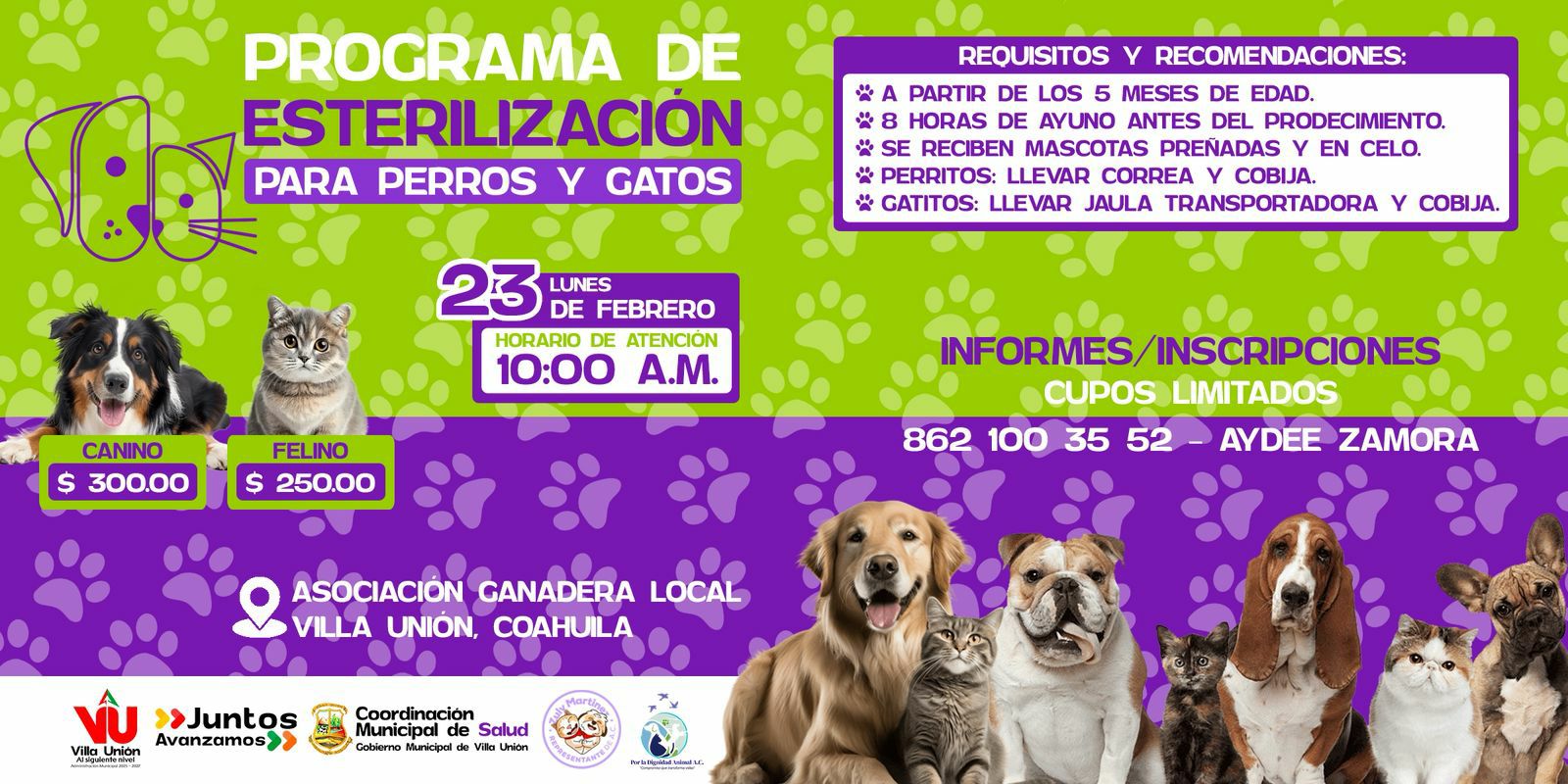 Villa Unión, Coahuila; a 18 de febrero de 2026.- Con el objetivo de fortalecer las acciones de salud pública y bienestar animal, el Gobierno Municipal de Villa Unión, que encabeza el alcalde Mario Humberto González Vela, llevará a cabo una campaña de esterilización para perros y gatos el próximo lunes 23 de febrero, a las 10:00 de la mañana, en las instalaciones de la Asociación Ganadera Local.Salud Coahuila refuerza vacunación ante rezago en dosis de sarampión