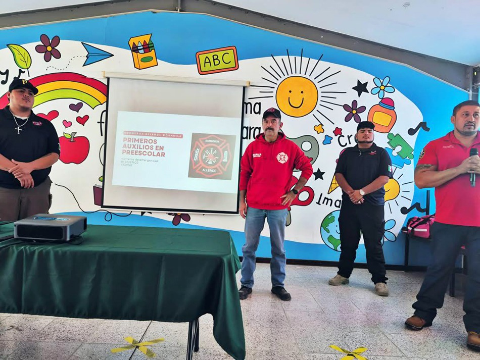 Allende, Coahuila; a 27 de noviembre de 2025.- El director de Bomberos de Allende, José Raúl Garza Tron, impartió una capacitación sobre primeros auxilios, dirigida a maestras y maestros de las regiones Carbonífera y Cinco Manantiales.