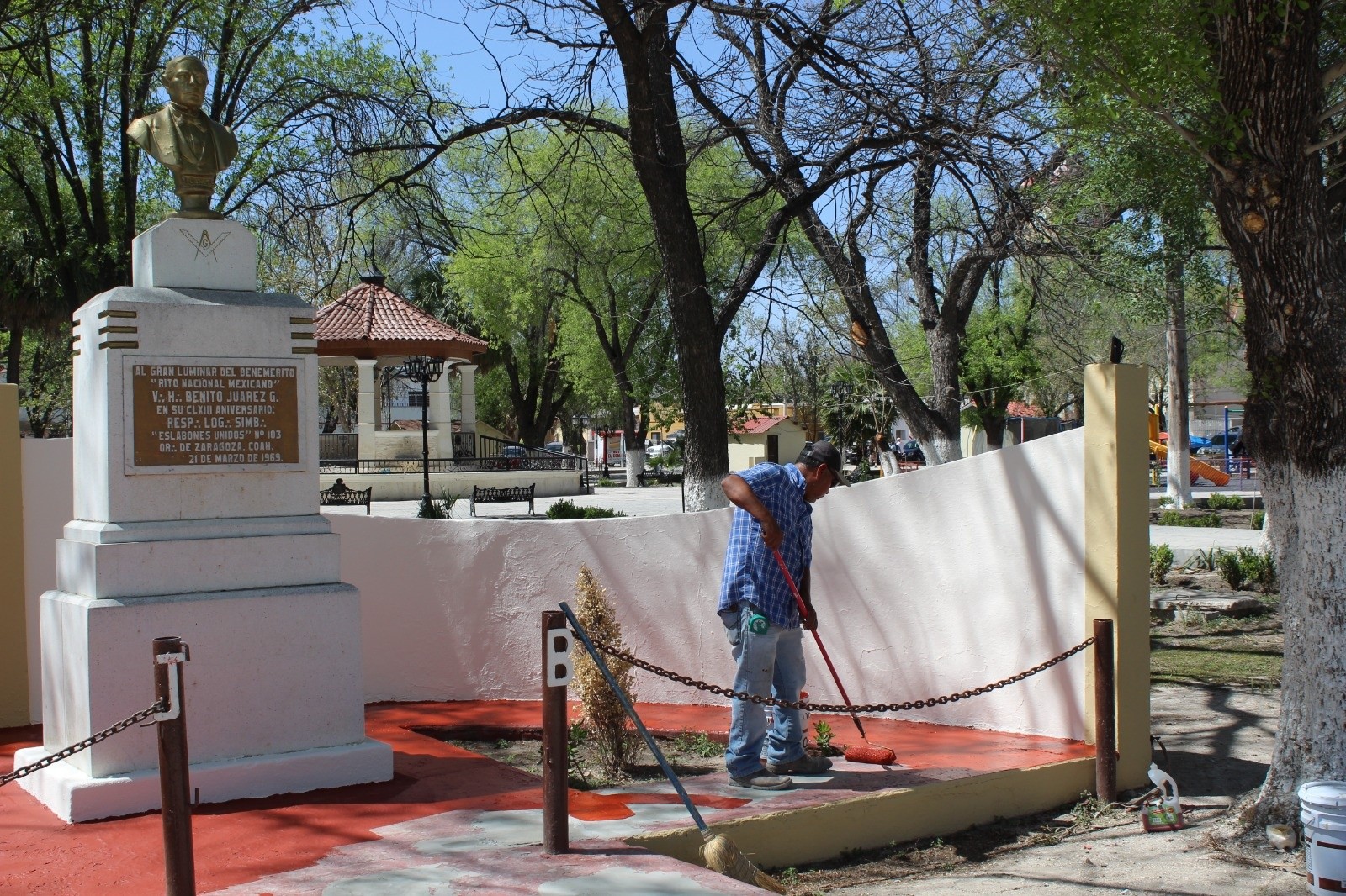 La Administración Municipal de Zaragoza que preside el alcalde Evelio Vara Rivera, llevó a cabo trabajos de rehabilitación en el hemiciclo a Juárez, localizado en la plaza principal Melchor Ocampo.